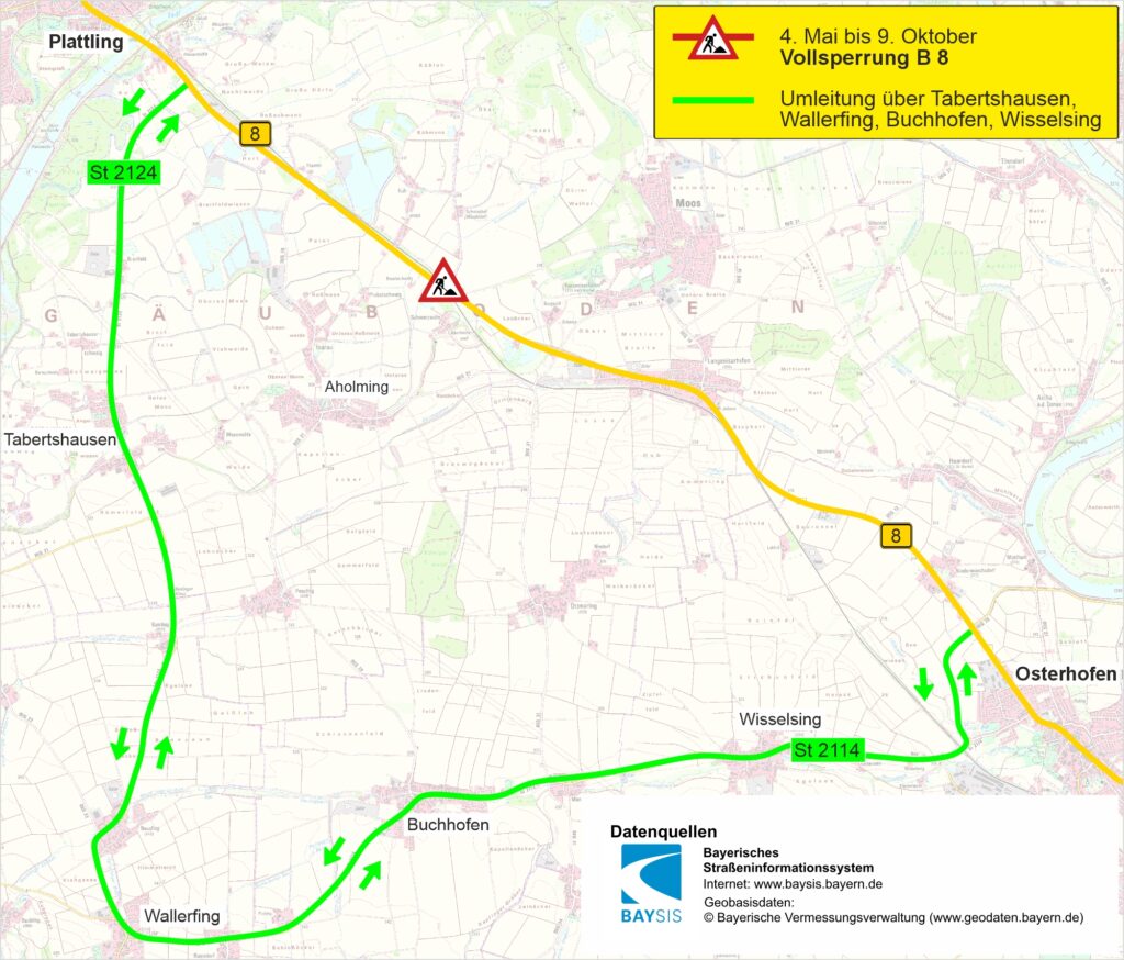 Diese Arbeiten sind nur unter Vollsperrung der B 8 möglich. Der Verkehr wird über die St 2124 Tabertshausen – Wallerfing – St 2114 Wallerfing – Buchhofen – Osterhofen und umgekehrt umgeleitet.