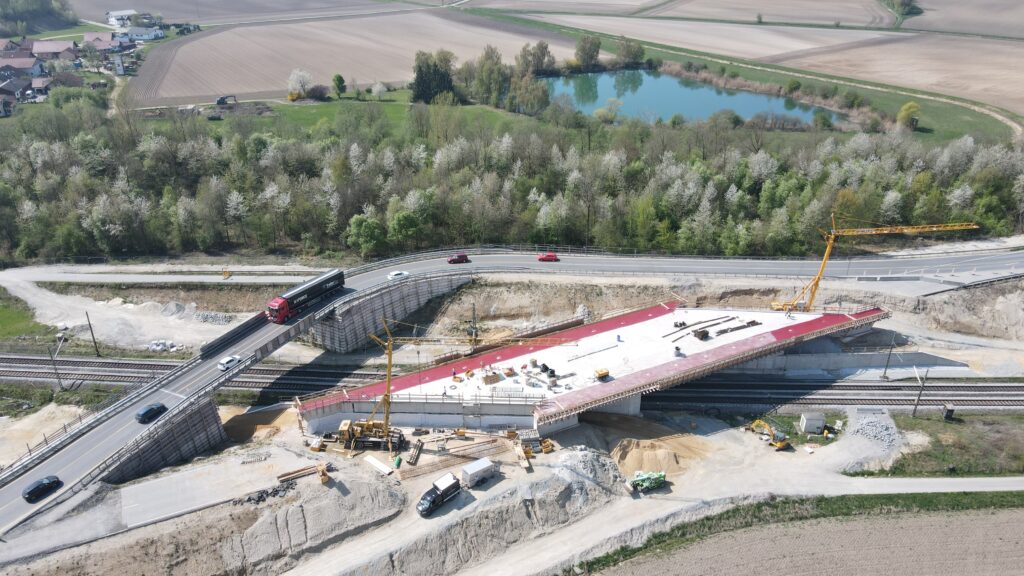 Die neue B 8-Brücke über die Bahnlinie bei Aholming ist fast fertig. In den nächsten vier Wochen werden die Abdichtung der Brückenplatte und die Brückenkappen hergestellt. Parallel dazu beginnen ab 4. Mai die Bauarbeiten für den Straßenanschluss. Dafür wird die B 8 im Bereich Aholming bis voraussichtlich Mitte Oktober für den Verkehr gesperrt.