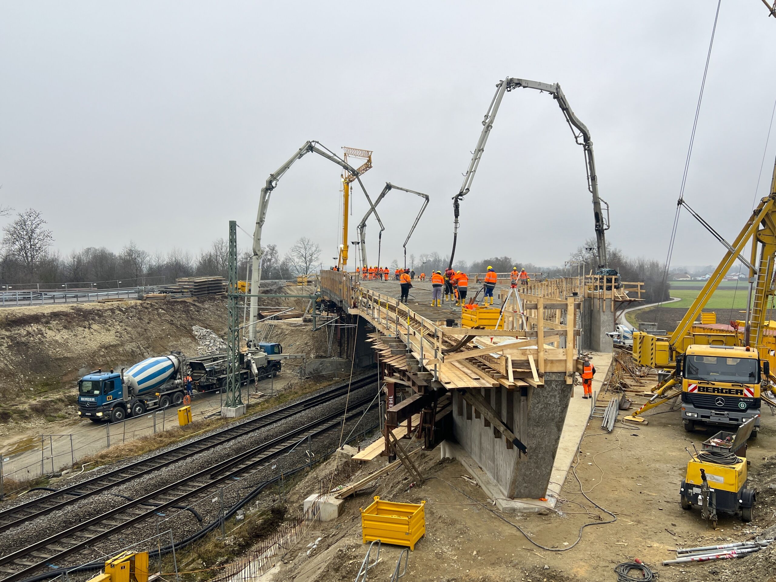 Großeinsatz vor Weihnachten: Am Mittwoch wurde die Brückenplatte für den Neubau der Schwarzwöhr-Brücke bei Aholming betoniert. Jetzt ist erst einmal Winterpause, im Januar geht es dann mit dem Ausbau der Überbautraggerüste weiter.